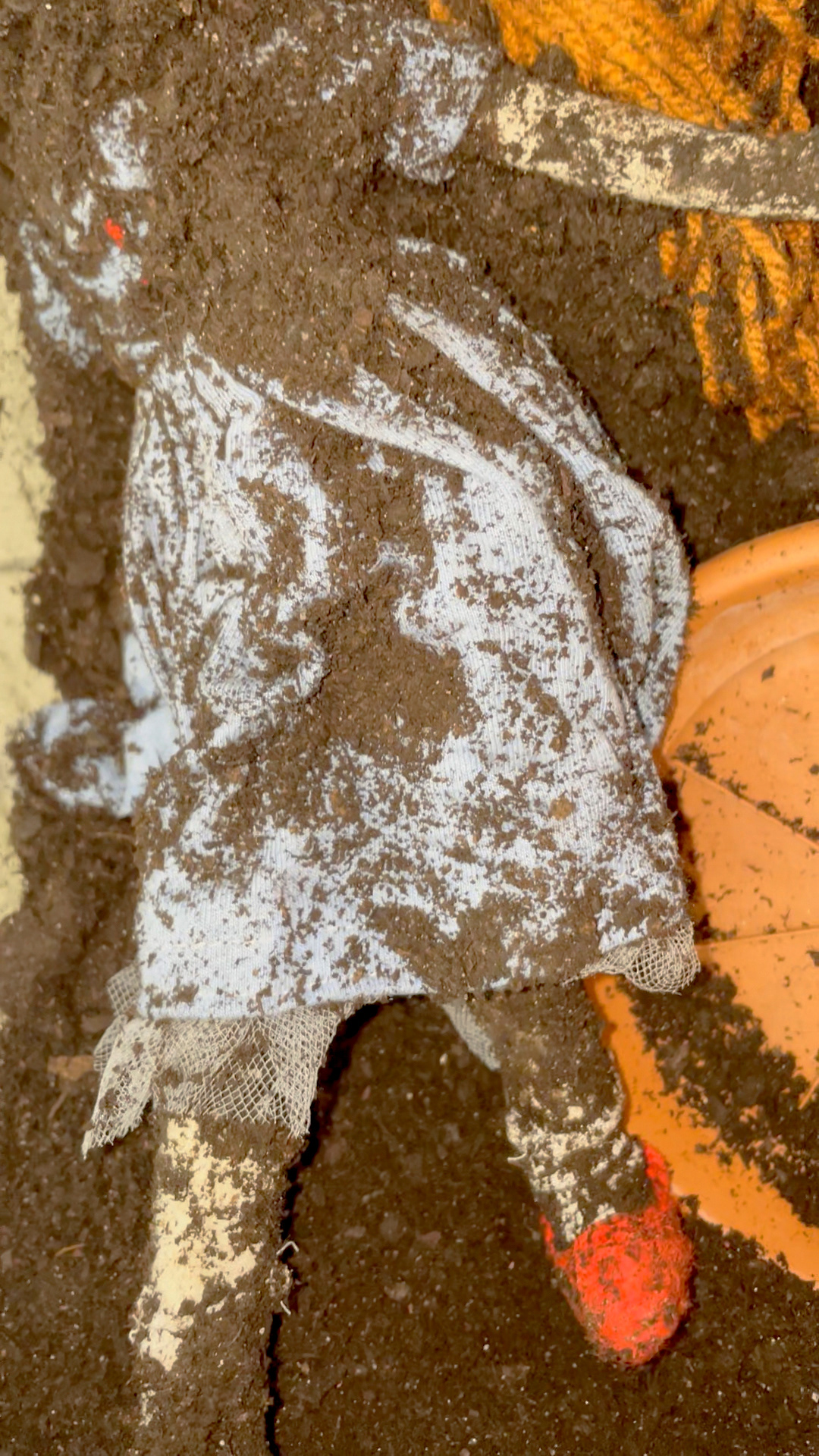 But when sand is replaced by ordinary soil, the associations change drastically. Objects abandoned in it no longer evoke thoughts of play, but of finality. In the context of mass graves, earth becomes the weight of memory. A doll found in it is not waiting for its owner to return the next day to continue playing. The doll’s owner will not return.